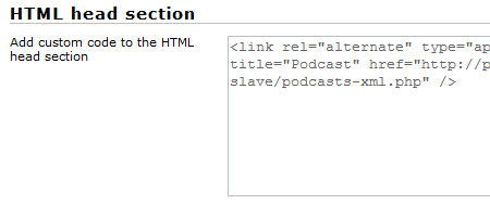 You can also add a reference to the podcast feed in your page’s header by adding a link tag. In BlogEngine.NET you must navigate to the settings page in the admin and paste a link tag with your podcast URL in the href attribute like so:
