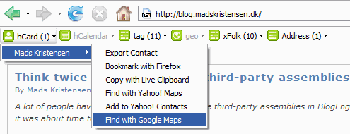 The hCard micro format is a XHTML representation of the vCard format that applications such as Outlook and iCal understands. By using hCard you can give your visitors an easy way to retrieve and store your contact information. Here is a screenshot of the hCard implementation in the Operator extension for Firefox.