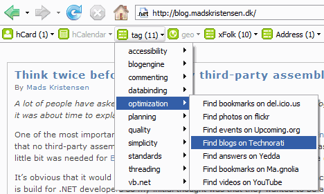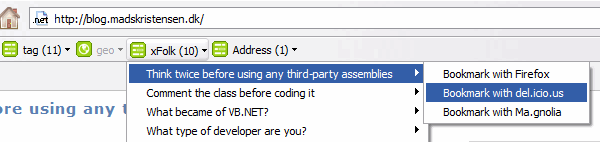 The xFolk micro format is for social bookmarking and can be used to let people add your posts and articles to services like del.icio.us, digg and dotnetkicks. That means you no longer need the social bookmarking links and icons on each blog post, because the browser can take care of it for the user. This is how my blog looks in the Operator extension.